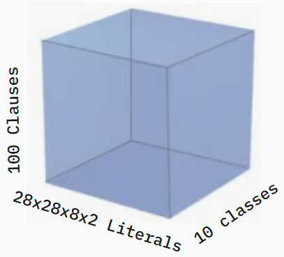 100 clauses x 10 classes x 28 x 28 pixels x 8 bits