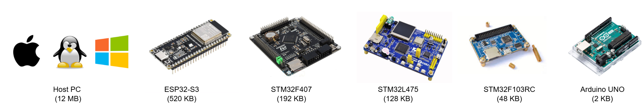 Vanilla TM (12 MB) --> LiME-TM Pruning (ESP32 520 KB) --> LiME-TM Compiler (STM32F4 192 KB) --> LiME-TM Compression (STM32L4 128 KB) --> LiME-TM Bare-metal (STM32F103 20 KB)